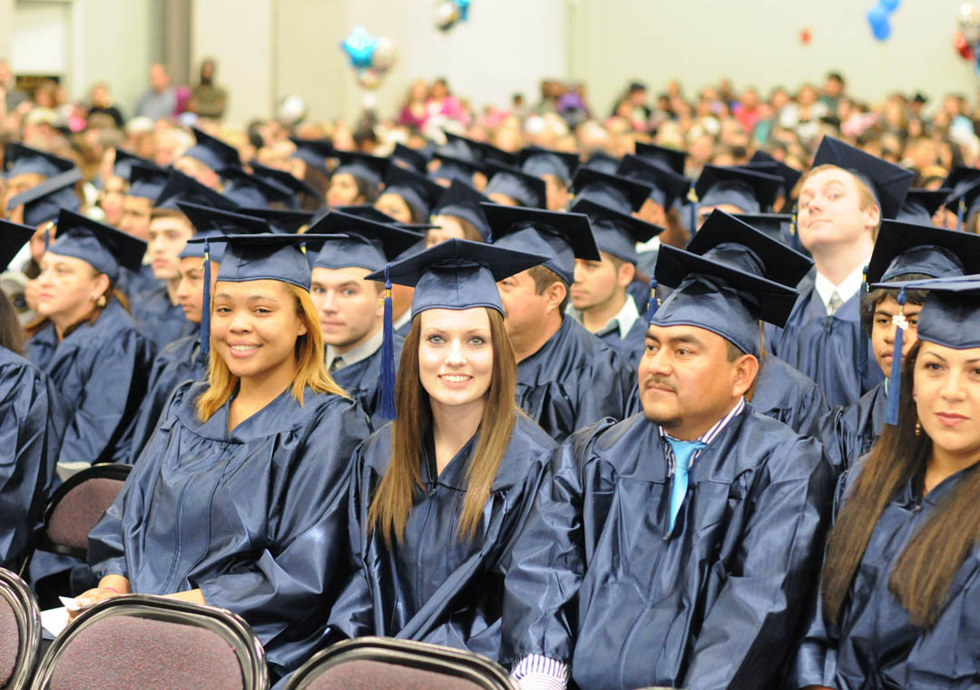 Students at Central Carolina Community College’s Jan. 16 Adult High School/General Educational Development graduation smile during the event in the Dennis A. Wicker Civic Center. More than 400 students completed their studies in the fall, the largest graduating class, by far, for adult education in the college’s history. About 250 of the graduates attended the exercises. For more information about Central Carolina Community College’s AHS/GED