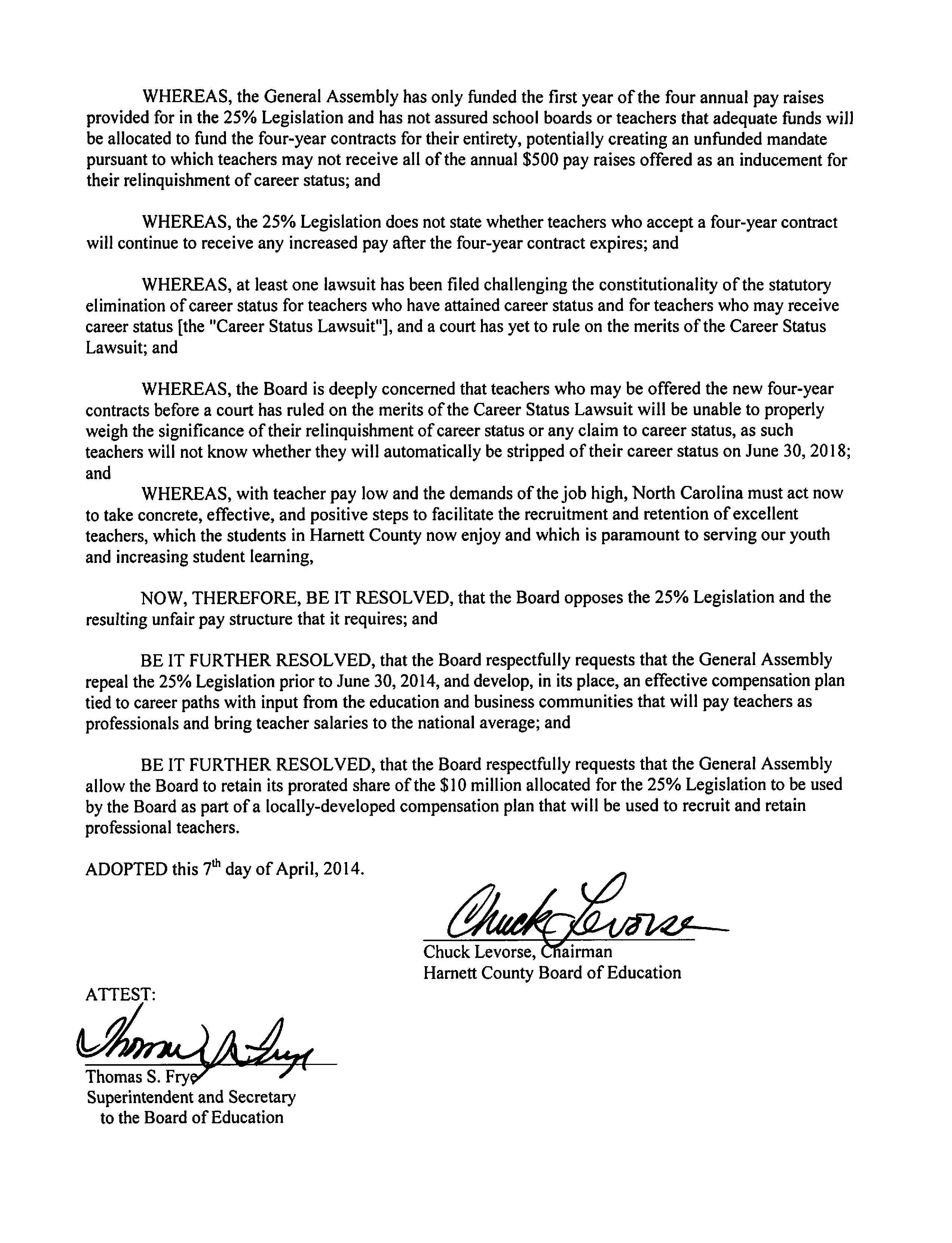 Harnett County Board of Education approved a Resolution